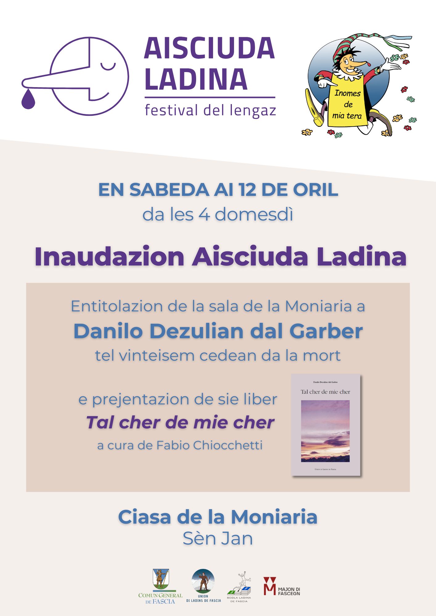 Entitolazion de la sala de la Moniaria a Danilo Dezulian dal Garber e prejentazion de sie ì liber “Tal cher de mie cher” – Ciasa de la Moniaria, Sèn Jan (desćèria chiò l placat) - en jebia ai 17 (e dantfora ai 10) de oril: “I eves te coa”